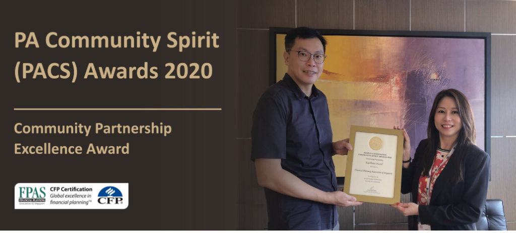 Financial Planning Association of Singapore (FPAS) is honoured to be awarded the PA Community Spirit (PACS) Awards 2020 – Community Partnership Excellence Award! This award is presented to honour exemplary strategic partners who had worked alongside People’s Association (PA) in bonding the community and building social capital.